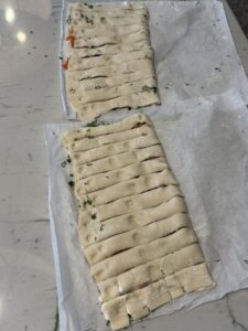 - Roll our the puff pastry into a 10×14 inch rectangle.