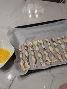 - Cut the folded pastry into 1/2 inch strips. Gently twist each strip into a spiral. Place on a parchment lined baking sheet. Brush with egg wash. Sprinkle with Everything Bagel seasoning.