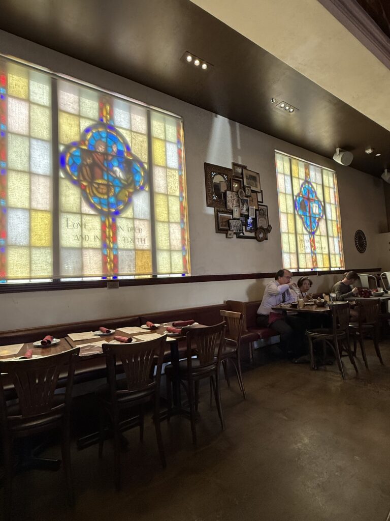 Set in a renovated church, this historic hip taco spot has amazing decor and food. Gourmet tacos, tequila flights and stunning stain glass windows. The ambiance leaves you with so much to check out and look at. Lots of variety of tacos and cocktails. We come here every time we’re in town.
